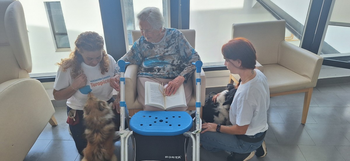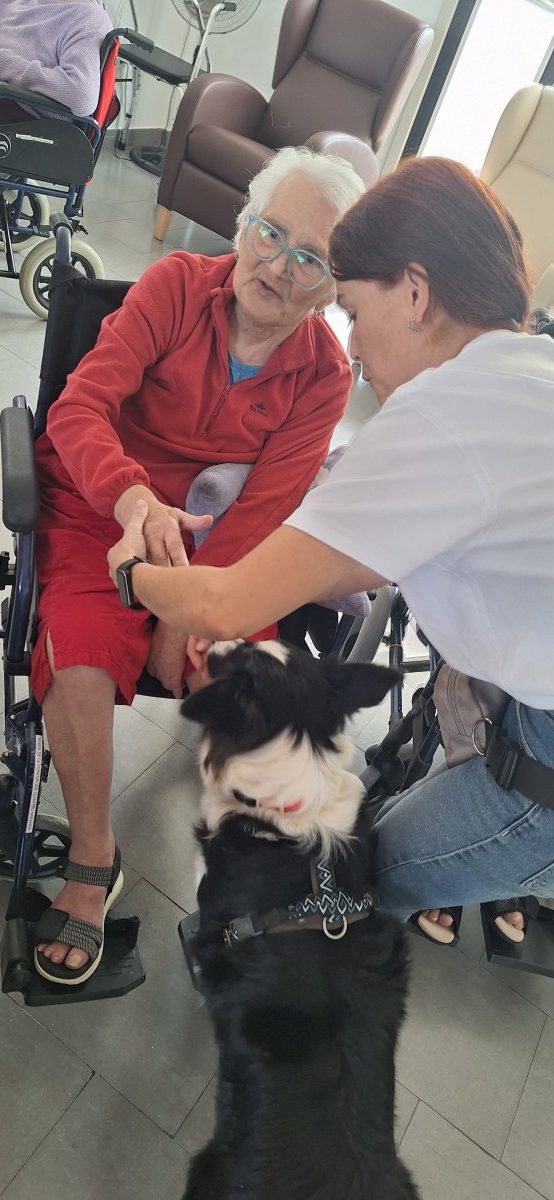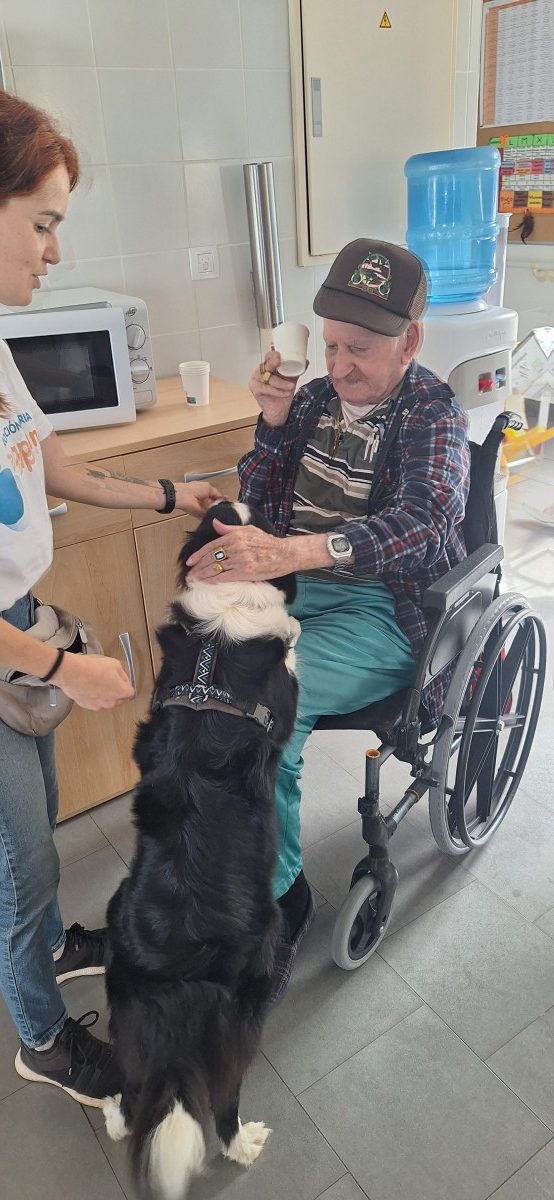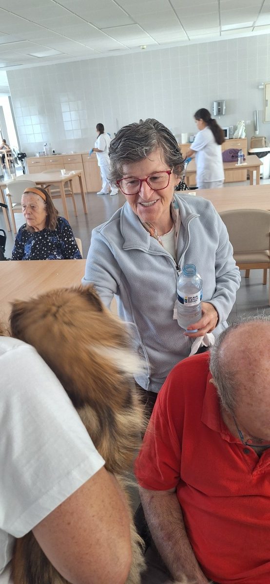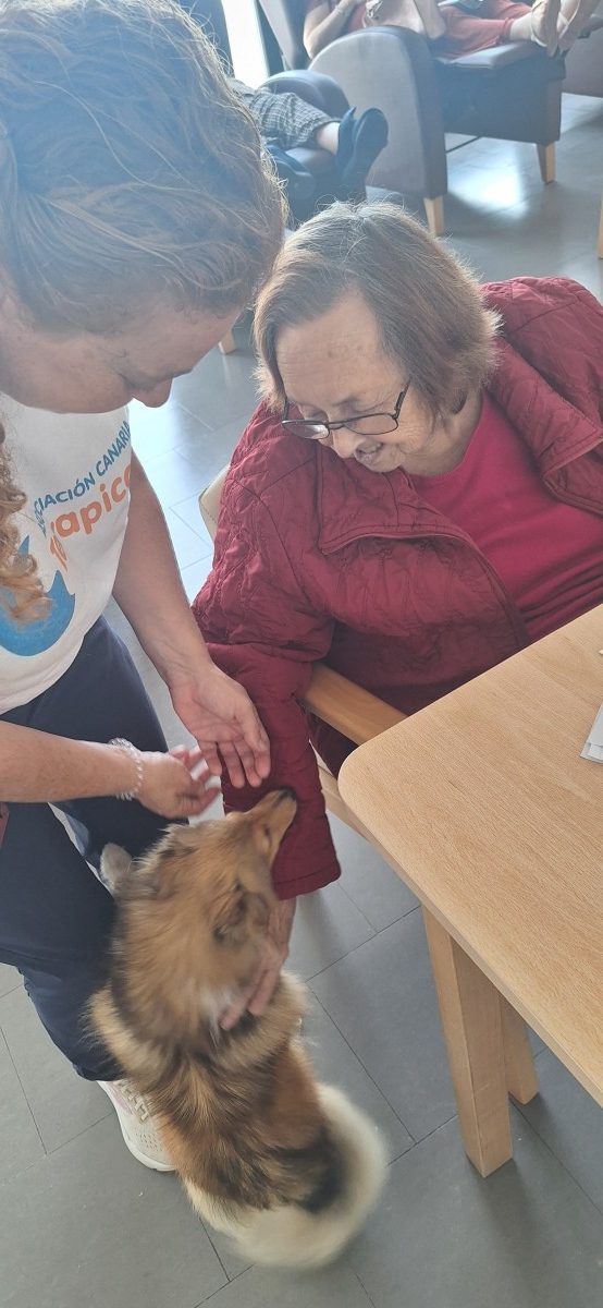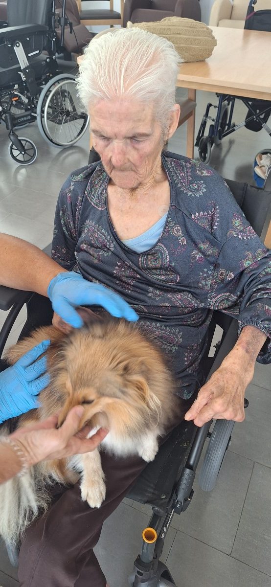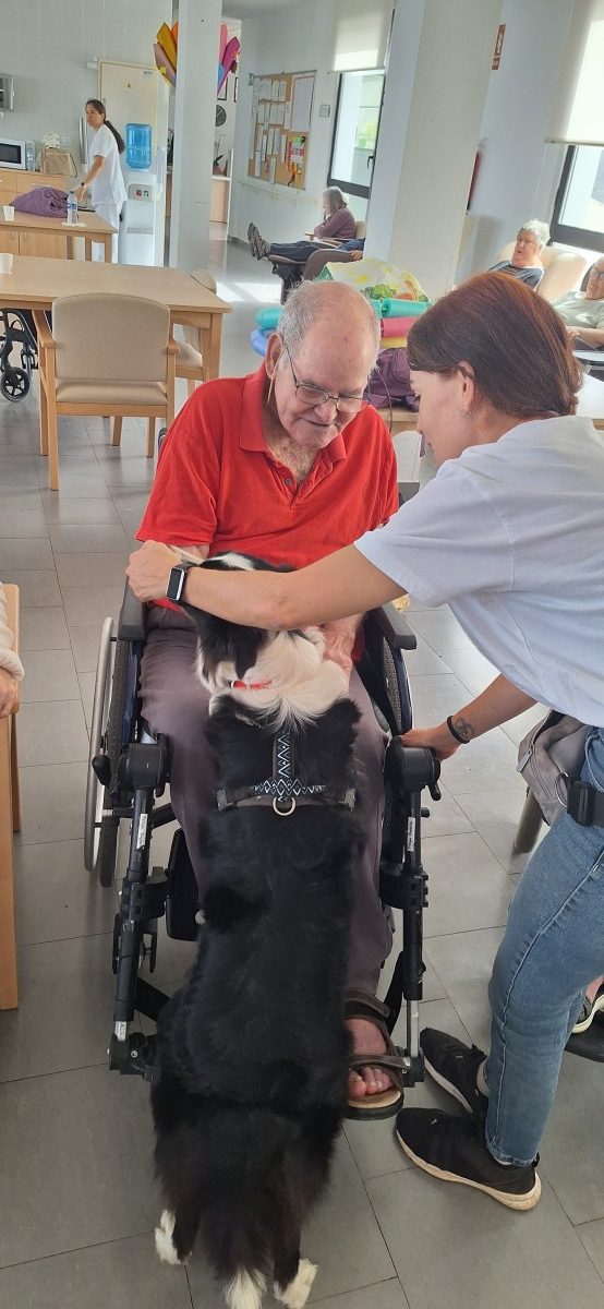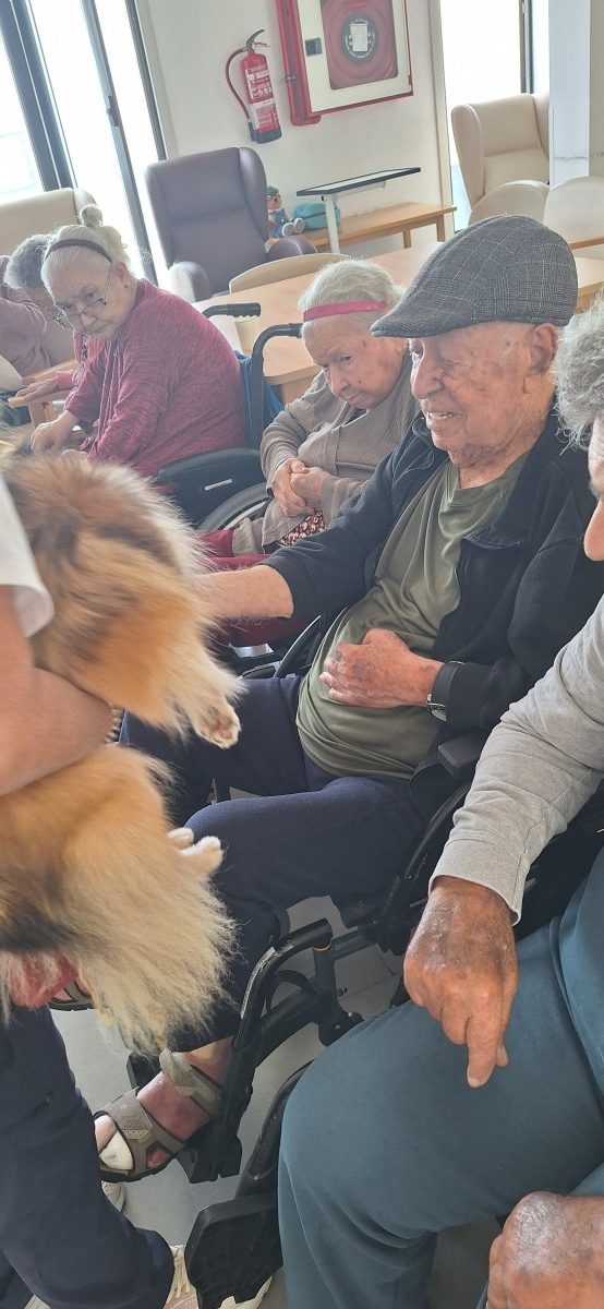 , cuya finalidad en el centro es la interacción de los animales con los mayores para fomentar el bienestar físico, emocional y social, creando actividades dirigidas por los profesionales de esta empresa donde los mayores no solo acarician a los perros sino realizan ejercicios cognitivos, físicos promoviendo así la socialización y la estimulación sensorial. Gracias a este tipo de talleres reducimos el estres y la depresión, mejoramos la atención y aumentamos la vitalidad y el autoestima en todas las personas usuarias.